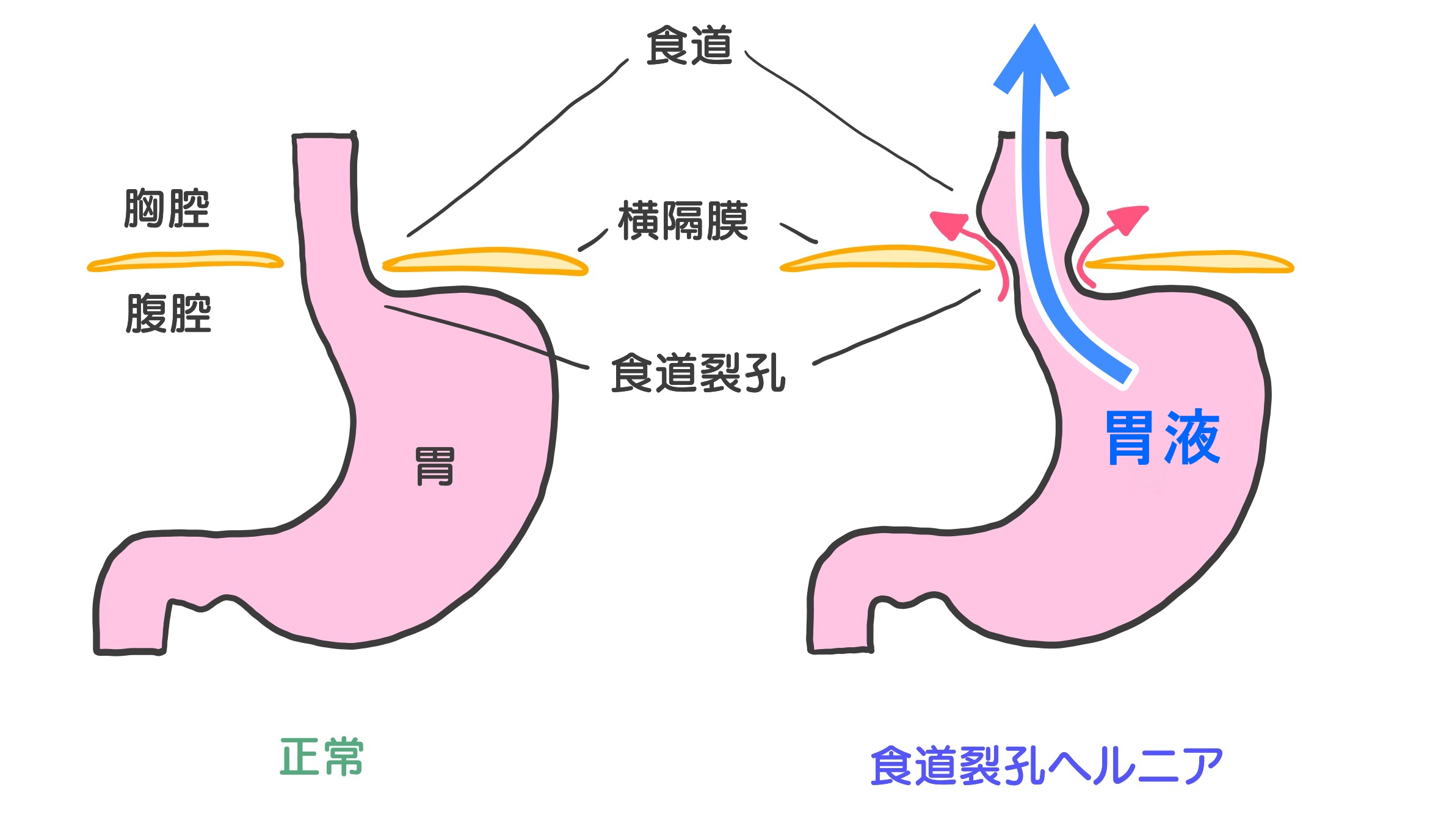 食道と胃の間は胃液が逆流しないように食道裂孔にある食道括約筋によって間仕切りされています。食道裂孔は横隔膜に空いた穴です。横隔膜がしっかり働くことで食道括約筋がきちんと締まることが出来るのです。ところがストレスなどの原因で横隔膜が緊張して機能が低下すると、食道括約筋がちゃんと働かなくなり、胃が食道の方向へ引っ張られて食道裂孔を越えてしまいます。